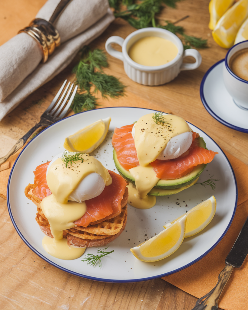 Traditionally, eggs Benedict is served on an English muffin with ham and hollandaise—but we’ve given it a major glow-up. We skip the muffin (and the carbs) and go for two equally delicious keto-friendly options: a crispy chaffle base if we want that toasty bite, or creamy avocado halves for something light and fresh. Layer it with silky smoked salmon, a perfectly poached egg, and rich, lemony hollandaise—and we’ve got ourselves a next-level brunch that’s as beautiful as it is satisfying.